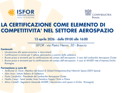 Il 13 aprile dalle ore 09:00 alle ore 16:00 si terrà il corso "LA CERTIFICAZIONE COME ELEMENTO DI COMPETITIVITA' NEL SETTORE AEROSPAZIO", presso la sede di ISFOR Per iscriversi cliccare QUI