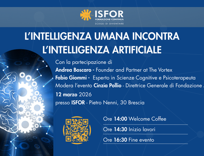 L’Intelligenza Umana incontra l’Intelligenza Artificiale 12/03/26 Il 12 marzo ore 14:30 presso ISFOR si terrà l'evento "l’Intelligenza Umana incontra l’Intelligenza Artificiale".