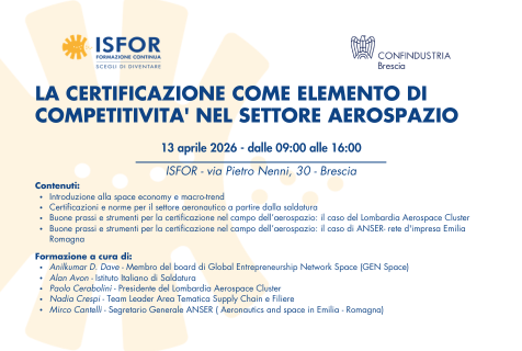 Il 13 aprile dalle ore 09:00 alle ore 16:00 si terrà il corso "LA CERTIFICAZIONE COME ELEMENTO DI COMPETITIVITA' NEL SETTORE AEROSPAZIO", presso la sede di ISFOR